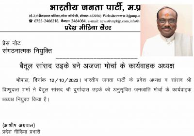 दुर्गादास उइके बने अजजा मोर्चा के कार्यवाहक अध्यक्ष