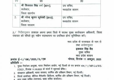 भारत निर्वाचन आयोग के निर्देशों के अनुपालन में खरगोन और रतलाम के कलेक्टर , मध्य प्रदेश शासन में उप सचिव , पदस्थ किए गए
