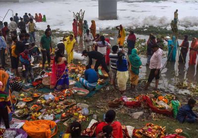 छठ पर जहरीले झाग से भरी यमुना में महिलाओं ने सूर्य को दिया अर्घ्य