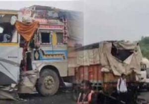 यात्री बस को पीछे से जोरदार मारी टक्कर,दोनों वाहनों के बीच में दबकार बाइक सवार भी आया चपेट में