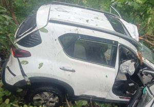 संतुलन बिगड़ने से 30 फीट गहरी खाई में गिरी कार, यरबैग खुलने से बची जान