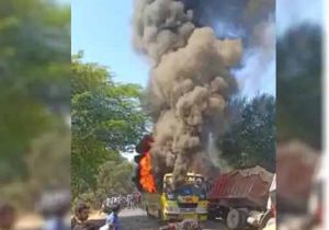बस की टक्कर से युवक की मौत, गुस्साए लोगों ने बस को आग लगाई