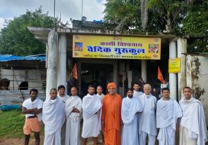 गुरूकुल में बच्चे आंख में पट्टी बांध कर शब्द स्पर्श मात्र से पढ़ाना सीखा