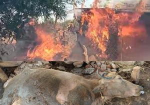 कोटर में आदिवासी परिवार में आगजनी से भैंस सहित घर जलकर हुए खाख