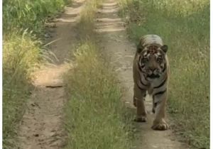 सतपुड़ा टाइगर रिजर्व में सैलानियों की जिप्सी के सामने आया बाघ