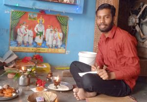 11 बार ऊं श्री चित्रगुप्ताय नमः लिखकर अभिषेक निगम ने घर पर चित्रगुप्त की पूजा की