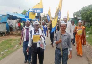 आम आदमी पार्टी ने बदलाव यात्रा निकाल तबल पानी हाट बाजार में गारंटी पत्र बांटकर की सदस्यता