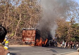चलते ट्रक में लगी आग ड्राइवर बचा बाल बाल घटना निवास जबलपुर मार्ग