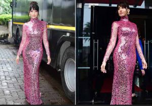 नोरा फतेही ने पिंक टाइट फिट ड्रेस में दिखाया हॉट लुक