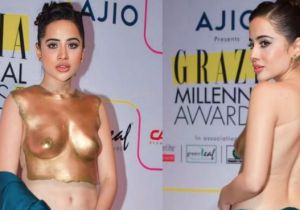 Urfi Javed गोल्डन ब्रेस्ट प्लेट का बैकलेस ब्लाउज बदन पर चिपकाकर पब्लिक में पहुंचीं