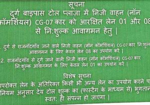 CG 07 Vehicles को दुर्ग बाईपास टोल प्लाजा पर अब निश्शुल्क आवागमन