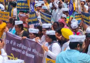 मणिपुर हिंसा : आप ने किया प्रदर्शन, राष्ट्रपति शासन लगाने की मांग