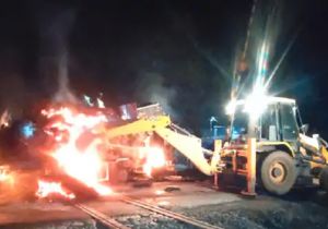 रेलवे क्रॉसिंग पर OHE लाइन के संपर्क में आने से पर ट्रक में लगी भीषण आग