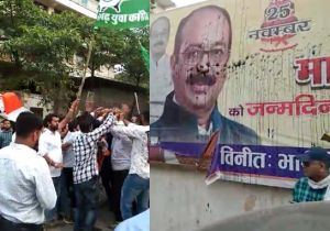 भाजपा कार्यालय के बाहर प्रदर्शन,आपस में भिड़े कार्यकर्ता