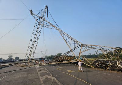 ग्राम सेंदरी के पास दो ट्रकों के बीच भिड़ंत, 11 के वी का विद्युत टावर धराशाई