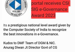 छत्तीसगढ़ डीएमएफ ऑनलाईन पोर्टलझ्ई-गवर्नेस के क्षेत्र में अवार्ड ऑफ एक्सीलेंस के लिए चयनित