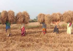 श्रमदान कर गांव के लोग खेतों से गौठान पहुंचा रहे पैरा