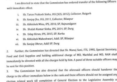 चुनाव आयोग ने बिलासपुर, रायगढ़ कलेक्टर सहित तीन एस पी हटाए