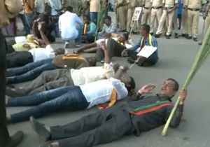 कावेरी जल विवाद: सड़कों पर लेट कर लगाए नारे, मांड्या में किसानों और कन्नड़ समर्थक संगठनों का विरोध प्रदर्शन