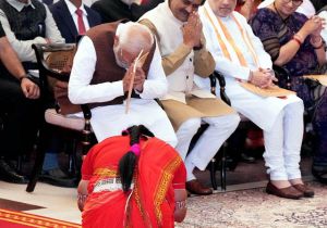 गायिका ऊषा ने घुटनों के बल बैठकर PM मोदी को किया प्रणाम, हिराबाई ने दिया आशीर्वाद