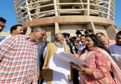 गृह मंत्री अनिल विज ने शहीद स्मारक में कमल आकार के 207 फुट ऊंचे मेमोरियल टॉवर पर कमल आकार की जिंक शीट लगाने के कार्य का किया मुआयना