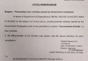4 Oct, 2022 07:58 PM IST | ASIAVARTANEWS.COMनई दिल्ली अब सरकारी अधिकारी अपने निजी वाहन पर भारत सरकार नहीं लिखवा सकेंगे। इसको लेकर...