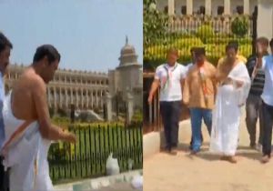 कांग्रेस कार्यकर्ताओं ने गोमूत्र और डेटॉल डालकर विधानसभा को किया साफ