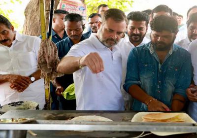 कांग्रेस नेता राहुल गांधी ने सड़क किनारे एक भोजनालय में डोसा बनाया