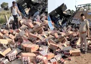 बीयर से लदा ट्रक कानपुर नेशनल हाईवे पर पलटा, ड्राइवर को बचाने की जगह ग्रामीणों में मची लूटने की होड़