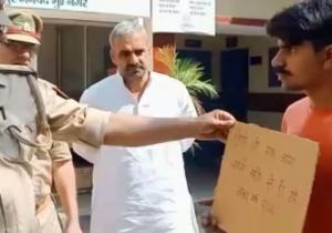 योगी जी माफ करना गलती म्हारे से हो गई...लिखी तख्ती टांग थाने सरेंडर करने पहुंचा फरार बदमाश
