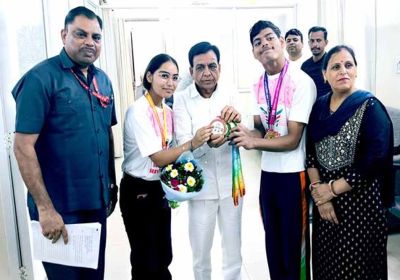 उप मुख्यमंत्री देवड़ा से मिले नेशनल चैम्पियनशिप विजेता आर्म रेसलर भाई-बहन रोहित और खुशी