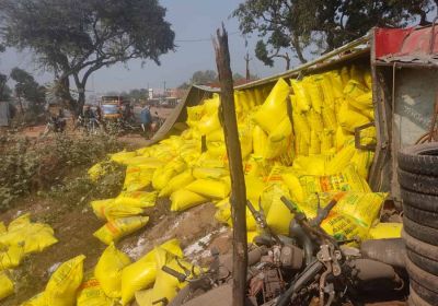 कोहरे के कारण यूरिया से भरा ट्रक पलटा