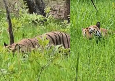 बांधवगढ़ टाइगर रिजर्व के कुंभी कछार क्षेत्र में धमोखर 6 साल की बाघिन घास खाते नजर आई, वायरल हुआ वीडियो