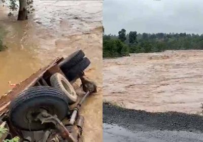 पुल पार करते समय अनियंत्रित होकर नदी में पलटा ट्रक, बाल-बाल बचे 5 लोग