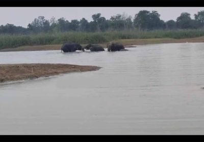 हाथी दल जंगल में बने तालाब में मस्ती करते हुए नजर आया