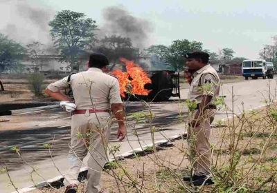 डीजल टैंकर अनियंत्रित होकर पलटा, लगी आग, ड्राइवर और हेल्पर घायल