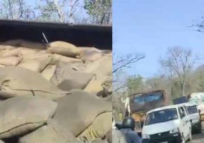 पेंड्रा बिलासपुर मुख्यमार्ग पर धान से लदा ट्रक पलटा, लगा लंबा जाम
