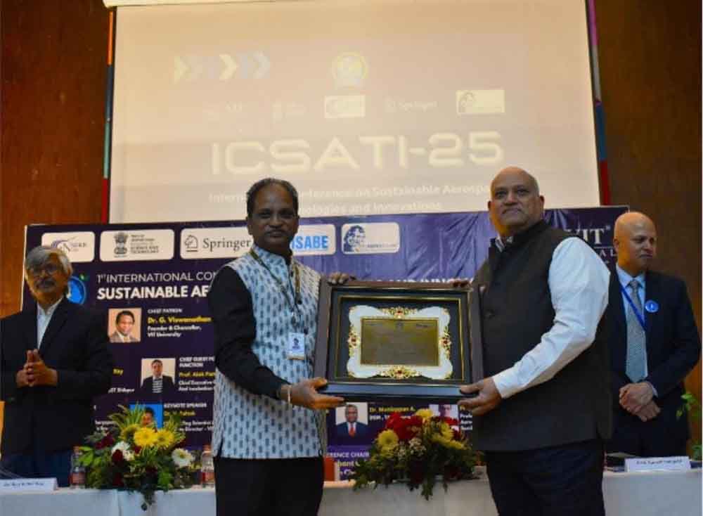 वीआईटी भोपाल विश्वविद्यालय के स्कूल ऑफ मैकेनिकल इंजीनियरिंग के एयरोस्पेस इंजीनियरिंग प्रोग्राम ने इंटरनेशनल सोसाइटी ऑफ एयर ब्रीथिंग इंजन (आईएसएबीई) के सहयोग से 7-8 फरवरी, 2025 को सस्टेनेबल एयरोस्पेस टेक्नोलॉजीज एंड इनोवेशन (आईसीएसएटीआई 2025) पर अपना पहला अंतर्राष्ट्रीय सम्मेलन सफलतापूर्वक आयोजित किया। सम्मेलन की शुरुआत से पहले, सभी प्रतिभागियों के लाभ के लिए गैस टर्बाइन प्रौद्योगिकी पर एक प्री-कॉन्फ्रेंस कार्यशाला भी आयोजित की गई।वीआईटी विश्वविद्यालय के उपाध्यक्ष श्री शंकर विश्वनाथन, डॉ. जयरामन को सम्मानित करते हुए
