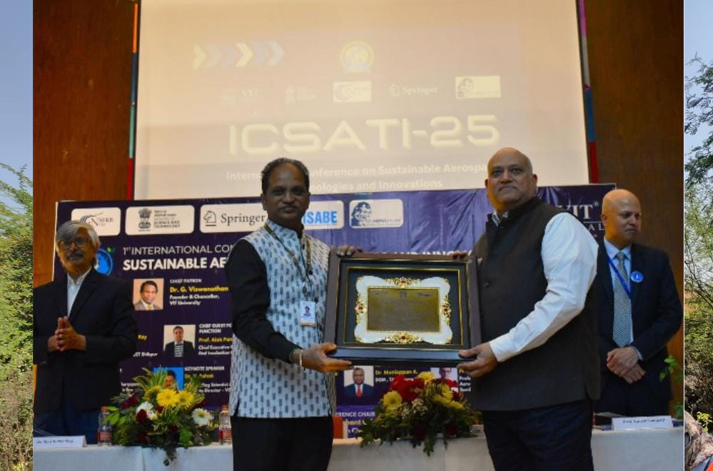 वीआईटी भोपाल विश्वविद्यालय के स्कूल ऑफ मैकेनिकल इंजीनियरिंग के एयरोस्पेस इंजीनियरिंग प्रोग्राम ने इंटरनेशनल सोसाइटी ऑफ एयर ब्रीथिंग इंजन (आईएसएबीई) के सहयोग से 7-8 फरवरी, 2025 को सस्टेनेबल एयरोस्पेस टेक्नोलॉजीज एंड इनोवेशन (आईसीएसएटीआई 2025) पर अपना पहला अंतर्राष्ट्रीय सम्मेलन सफलतापूर्वक आयोजित किया। सम्मेलन की शुरुआत से पहले, सभी प्रतिभागियों के लाभ के लिए गैस टर्बाइन प्रौद्योगिकी पर एक प्री-कॉन्फ्रेंस कार्यशाला भी आयोजित की गई।वीआईटी विश्वविद्यालय के उपाध्यक्ष श्री शंकर विश्वनाथन, डॉ. जयरामन को सम्मानित करते हुए