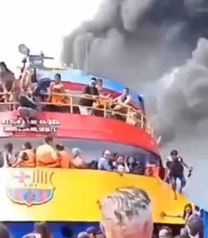 इंडोनेशिया के तट पर 280 लोगों से भरी एक जहाज में आग लग गई, जिससे घबराए यात्रियों ने समुद्र में छलांग लगा दी. इस घटना का वीडियो सोशल मीडिया पर वायरल है, जिसमें जहाज पूरी तरह से आग की लपटों में घिरा हुआ दिखाई दे रहा है और आसमान में काले धुएं का गुबार उठ रहा है. इस दुर्घटना में तीन लोगों की मौत और 18 लोगों के घायल होने की खबर है. दुर्घटना का शिकार हुई इस जहाज का नाम केएम बार्सिलोना वीए (KM Barcelona VA) है.