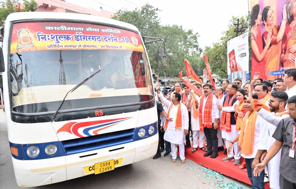 मुख्यमंत्री विष्णु देव साय ने आज रायपुर शहर के आकाशवाणी चौक स्थित माँ काली मंदिर से डोंगरगढ़ तक निःशुल्क बस सेवा का शुभारंभ किया। रायपुर से माँ बम्लेश्वरी के दर्शन के लिए डोंगरगढ़ जाने वाले श्रद्धालुओं को इस बस सेवा का नि:शुल्क लाभ मिलेगा। इस अवसर पर मुख्यमंत्री साय ने कालीमाता सेवा समिति की इस पहल की सराहना करते हुए समिति के पदाधिकारियों को बधाई एवं शुभकामनाएँ दीं। उन्होंने माँ काली और माँ बम्लेश्वरी से छत्तीसगढ़ में खुशहाली, समृद्धि और शांति की कामना की। साथ ही सभी प्रदेशवासियों को शारदीय नवरात्र की हार्दिक बधाई और शुभकामनाएँ भी प्रेषित कीं।