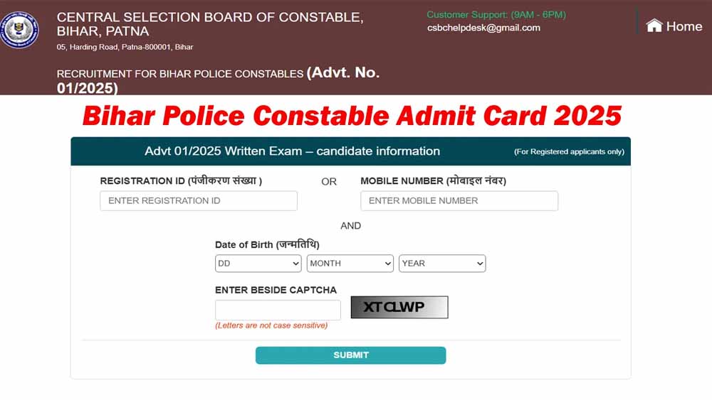 सेंट्रल सिलेक्शन बोर्ड ऑफ कांस्टेबल (CSBC) ने 9 जुलाई 2025 को बिहार पुलिस कांस्टेबल भर्ती परीक्षा के लिए एडमिट कार्ड जारी कर दिया है, जो भी उम्मीदवार इस परीक्षा में शामिल होना चाहते हैं, वे अब आधिकारिक वेबसाइट csbc.bihar.gov.in पर जाकर अपना प्रवेश पत्र डाउनलोड कर सकते हैं।