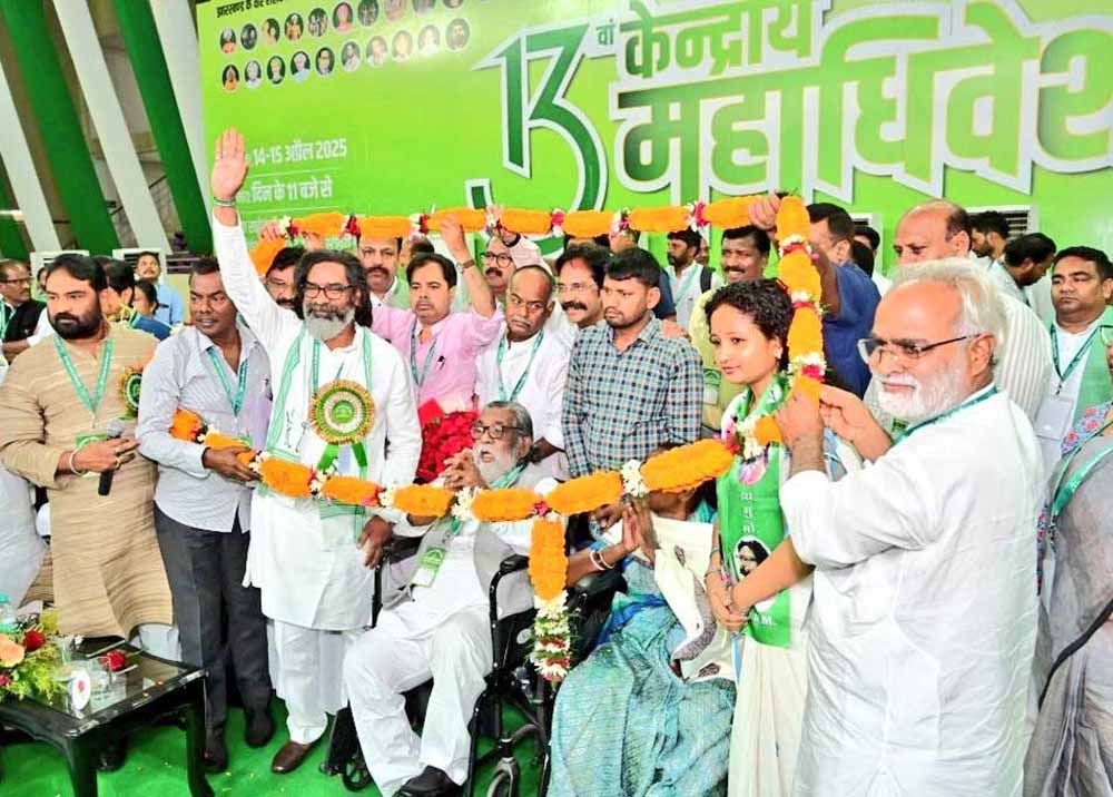 झारखंड मुक्ति मोर्चा के 13वें केंद्रीय महाधिवेशन के दूसरे और अंतिम दिन यानी मंगलवार को दिशोम गुरु शिबू सोरेन को झामुमो का संस्थापक संरक्षक और मुख्यमंत्री हेमंत सोरेन को केंद्रीय अध्यक्ष बनाया गया। राजधानी रांची के खेलगांव में आयोजित झामुमो का यह 13वां केंद्रीय महाधिवेशन है।