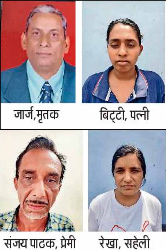 18 अप्रैल को बिट्टी जार्ज (32) ने संजय को रेखा के माध्यम से घर बुलवाया। बिट्टी ने जार्ज की आंखों में ड्राप डाला था और वह बेडरूम में सो रहे थे। तभी बिट्टी बाहर आ गई और संजय अंदर घुस गया। उसने जार्ज से मारपीट की और मुंह दबाकर मौत के घाट उतार दिया। बाद में उसे सिर के बल टाइल्स पर गिरा दिया, जिससे उसका सिर फूट गया। तब तीनों ने चादर और तकिये से कमरे का खून साफ किया और उसे अस्पताल पहुंचाकर बाथरूम में गिरने से मौत की झूठी कहानी रची। चार घंटे तक शव को घर में रखे रहे आरोपित: एसआइ रघुवंशी के अनुसार मौत के बाद बिट्टी चार घंटे तक शव को घर में रखे रही। उसने पुलिस से पूछताछ में बताया कि उसकी पति जार्ज अक्सर कहता था कि उसे किसी बाबा का आशीर्वाद प्राप्त है कि जब भी वह मरेगा तो चार घंटे बाद वापस जिंदा हो जाएगा। इसीलिए बिट्टी और उसके साथियों ने चार घंटे तक शव रखकर इतंजार किया कि कहीं वह वापस जिंदा न हो जाए। बाद में उसे अस्पताल भेजा।