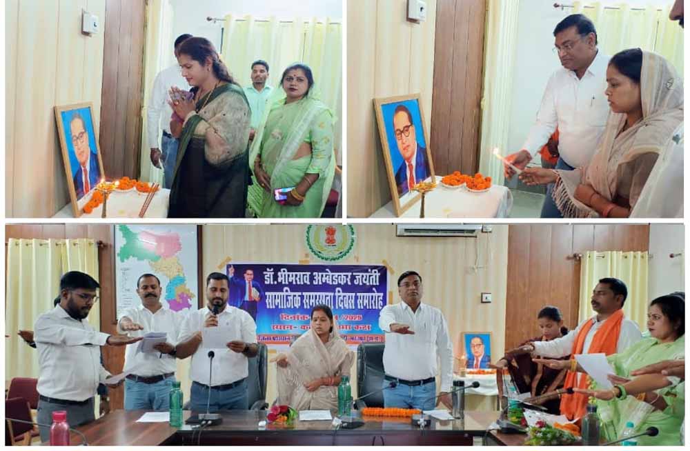 आज डॉ. भीमराव अंबेडकर जयंती एवं सामाजिक समरसता दिवस के अवसर पर छत्तीसगढ़ शासन के पंचायत एवं ग्रामीण विकास विभाग के आदेशानुसार जिला मनेंद्रगढ़-चिरमिरी-भरतपुर के कलेक्ट्रेट सभाकक्ष में भव्य कार्यक्रम का आयोजन किया गया। यह कार्यक्रम कलेक्टर एवं जिला दंडाधिकारी डी. राहुल वेंकट निर्देशानुसार और प्रभारी जिला पंचायत सीईओ  नितेश उपाध्यक्ष के मार्गदर्शन में हुआ। कार्यक्रम की शुरुआत भारत रत्न डॉ. भीमराव अंबेडकर के चित्र पर पुष्पांजलि अर्पित कर की गई, जिसमें जनपद सदस्य, सरपंच गण और अन्य जनप्रतिनिधि शामिल हुए। मुख्य समारोह में जिला पंचायत अध्यक्ष श्रीमती यशवंती सिंह मुख्य अतिथि थीं, जबकि जिला पंचायत उपाध्यक्ष राजेश साहू विशिष्ट अतिथि के रूप में उपस्थित थे। इस दौरान विभिन्न समाजों के प्रमुखों को मंच पर सम्मानित किया गया।