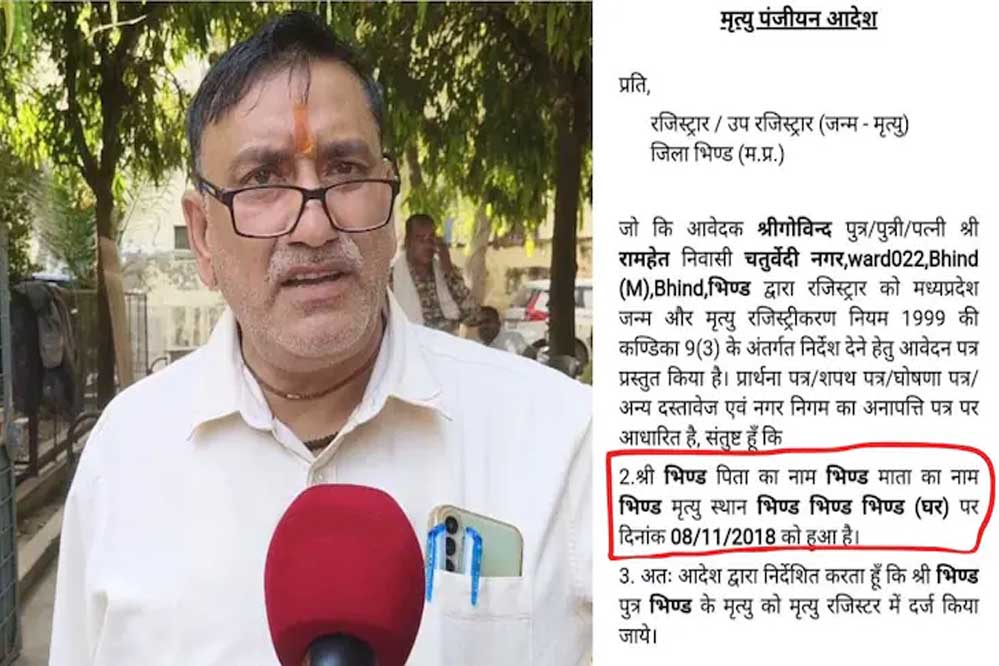 दरअसल, ये पूरा मामला शहर के चतुर्वेदी नगर का है. यहां रहने वाले गोविंद के पिता रामहेत का निधन वर्ष 2018 में हो गया था. अप्रैल 2025 में जब उनके परिवार को डेथ सर्टिफिकेट की आवश्यकता पड़ी, तो उन्होंने आवेदन किया. 5 मई 2025 को जब भिंड तहसीलदार कार्यालय से प्रमाण पत्र जारी हुआ, तो इसे देखकर आवेदक के साथ ही बाकी के दूसरे लोग चौंक गए, क्योंकि उस प्रमाण पत्र में मृतक का नाम “भिंड”, पता “भिंड” और स्थान “भिंड” दर्ज था.