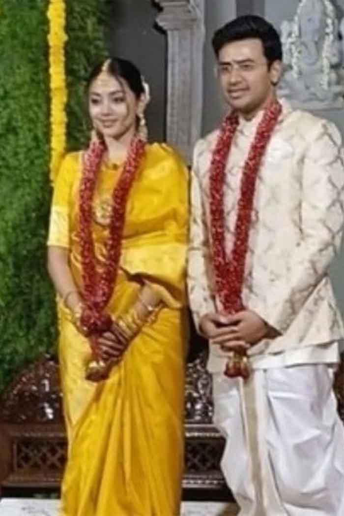 भाजपा सांसद तेजस्वी सूर्या ने शादी कर ली है। उनका विवाह शास्त्रीय संगीत की कलाकार शिवश्री स्कंदप्रसाद से हुआ है। उन्होंने हिंदू रीति-रिवाजों और कन्नड़ परंपरा के अनुसार विवाह किया। इस मौके पर केंद्रीय मंत्री वी. सोमन्ना, अमित मालवीय, प्रताप सिम्हा, बीवाई विजयेंद्र समेत कई नेता पहुंचे थे। कई नेताओं ने शादी समारोह की तस्वीरें सोशल मीडिया पर साझा की हैं। तस्वीरों में शिवश्री स्कंदप्रसाद पीले रंग की कांचीपुरम सिल्क साड़ी और गोल्ड जूलरी में नजर आती हैं। इसके अलावा तेजस्वी सूर्या ने सफेद और गोल्डन कलर की ड्रेस पहनी हुई है। सफेद धोती और गोल्डन कलर की स्थानीय पगड़ी में वह बेहद सुंदर लग रहे हैं।