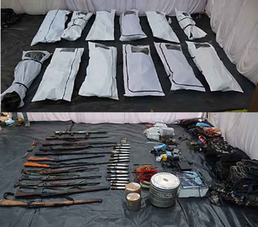 छत्तीसगढ़-बीजापुर मुठभेड़ में मारे गए 12 नक्सलियों के शव और बड़ी संख्या में हथियार बरामद