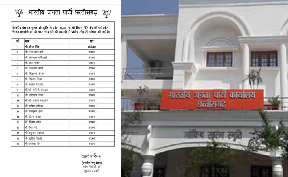 बीजेपी नगरीय निकाय और त्रि-स्तरीय पंचायत चुनावों को लेकर विभिन्न स्तरों पर समितियों का गठन कर रही है। नगरीय निकाय चुनाव के लिए प्रदेश, संभाग, जिला समितियों व निकायों के लिए प्रभारियों की घोषणा के बाद सोमवार को त्रि-स्तरीय पंचायत चुनाव को लेकर  प्रदेश अध्यक्ष किरण सिंह देव एवं प्रदेश संगठन महामंत्री पवन साय की सहमति से प्रांतीय टीम की घोषणा की गई। पंचायत चुनावों के लिए जिला प्रभारियों की घोषणा पहले ही की जा चुकी है। पंचायत चुनावों के लिए घोषित प्रदेश समिति के संयोजक सौरभ सिंह बनाए गए हैं। 19 सदस्यीय समिति में भरत लाल वर्मा, जगन्नाथ पाणिग्राही, राजा पांडेय, अखिलेश सोनी, नीलकण्ठ टेकाम, निरंजन सिन्हा, ललित चन्द्राकर, श्रीमती शालिनी राजपूत, आशाराम नेताम, अलका चन्द्राकर, सतीश लाटिया, रामकुमार भट्ट, दीपक म्हस्के, डॉ. किरण बघेल, वैभव बैस, अनुराग अग्रवाल, सुनील पिल्लई, आकाश विग को समिति का सदस्य बनाया गया है।