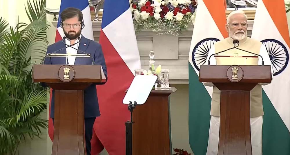 पीएम मोदी ने मंगलवार को चिली के राष्ट्रपति गेब्रियल बोरिक फॉन्ट और उनके उच्च स्तरीय प्रतिनिधिमंडल का भारत में उनके पहले राजकीय दौरे पर स्वागत किया। उन्होंने चिली को लैटिन अमेरिका में भारत का 'महत्वपूर्ण मित्र और साझेदार' बताया। संयुक्त प्रेस कॉन्फ्रेंस को संबोधित करते हुए पीएम मोदी ने बढ़ते द्विपक्षीय संबंधों पर प्रकाश डाला और सहयोग को अधिक बढ़ाने की जरूरत पर जोर दिया।